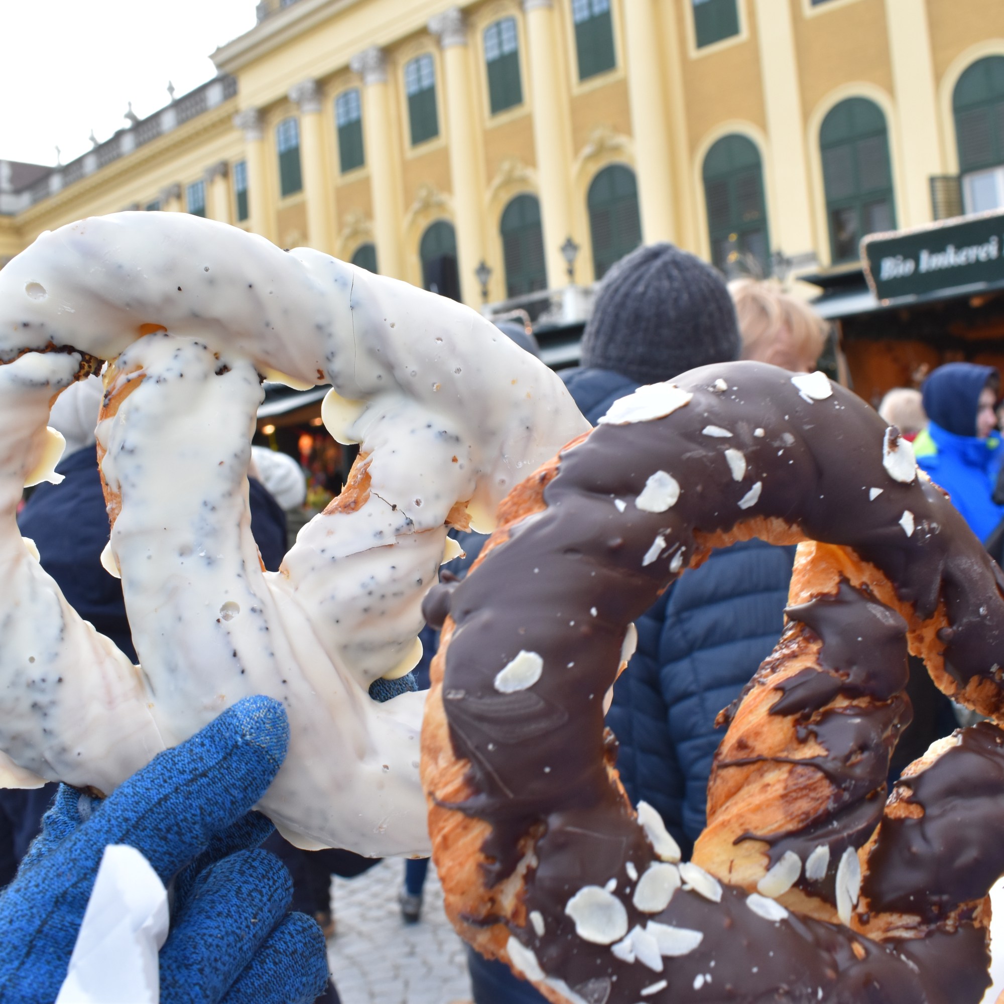 Zlokalizowany przy pałacu Schönbrunn, położony w pięknej lokalizacji zdala od miasta ale zaledwie w odległości 20 minut metrem i 10 minut spacerem, ten jarmark zaskoczył mnie luźną atmosferą, a jeśli wybierzesz się tam rano, gwarantuję, że tłumów nie będzie i na spokojnie można popatrzeć sobie na wszystkie ozdoby, a także skosztować preclów pod każdą postacią i świetnej wiedeńskiej kawy!
